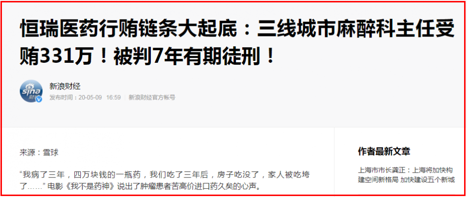 昨天,小号编发了一条消息《医药“市值一哥”再曝贿赂案:恒瑞医药140万“黑金”腐蚀麻醉科主任》。