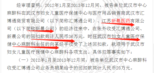 判决文书显示,经审理查明,2012年1月至2013年12月间,被告单位武汉市中心麻醉科在武汉市妇女儿童医疗保健中心与医疗用品销售商武汉市汇博通商贸有限公司(以下简称汇博通公司)、江苏新晨医药有限公司(以下简称新晨公司)的经济往来中,在账外收受汇博通公司、新晨公司的回扣款共计人民币36万元,时任武汉市妇女儿童医疗保健中心麻醉科主任的向某经手收受了上述回扣款,款项用于武汉市妇女儿童医疗保健中心麻醉科各项支出。
