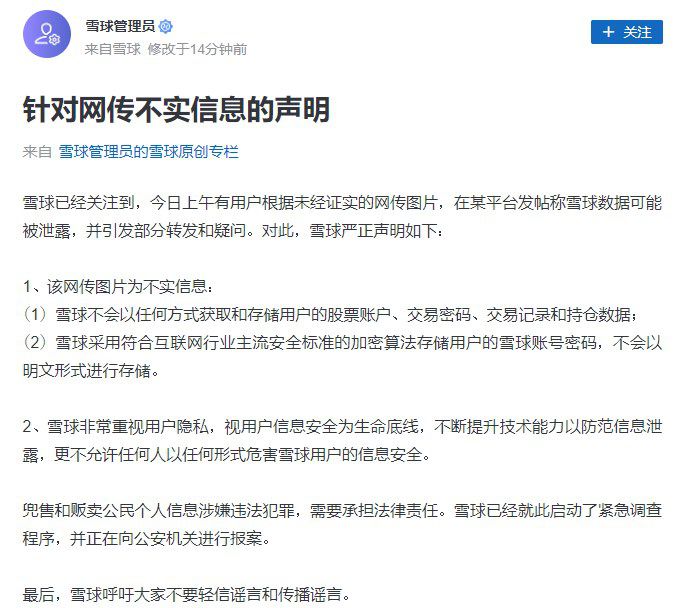 雪球表示,该网传图片为不实信息,雪球不会以任何方式获取和存储用户的股票账户、交易密码、交易记录和持仓数据。雪球还称,呼吁大家不要轻信谣言和传播谣言。