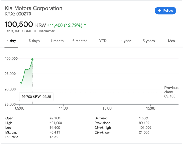在此消息被曝出之后,周三起亚的股价大涨,涨幅最高达到了14%,交易量达到了1997年以来的最高点。起亚位于首尔的代表和苹果公司位于加州的代表拒绝对该报道发表评论。