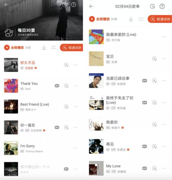 2月4日这一天,细心的虾友们发现,虾米为平台所有用户统一定制了“每日30首”歌单,最后7首歌的标题,温柔诉说着每个人心中的不舍。