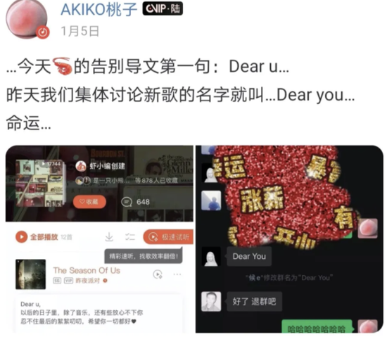 就在同一天,虾米编辑部更新了“告别”歌单《虾米留言簿 | 再见一万遍,我的朋友》。歌单的第一首歌是昨夜派对的《The Season of Us》,主唱AKIKO桃子不禁感叹命运的巧合,虾米的告别导文第一句是“Dear u......”,而他们在前一天集体讨论新歌的名字就叫“Dear you”。