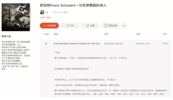 Joseph也觉得在虾米听歌像是阅读一本翻不到底的书。他听的古典音乐评论很少过百,但是曲子或专辑的介绍,都会详细地写出作者的生平、创作背景、对曲目的赏析。