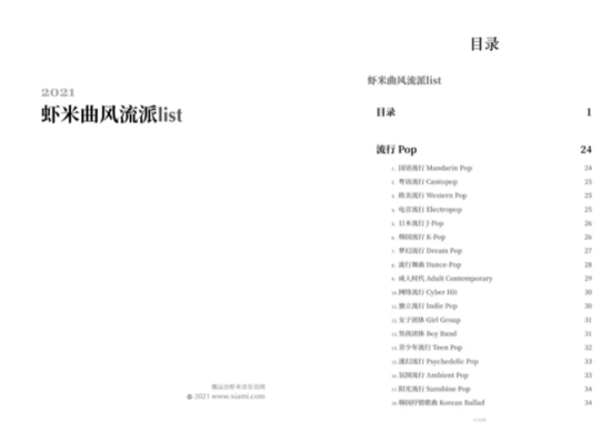这不失为虾米的客观评价。虾米用户在虾米关停前梳理出了一份《2021虾米音乐曲风流派list》,这份PDF一共436页,涵盖流行、摇滚、爵士等24个一级分类和548二级分类,每个分类下都有非常详细的科普介绍。
