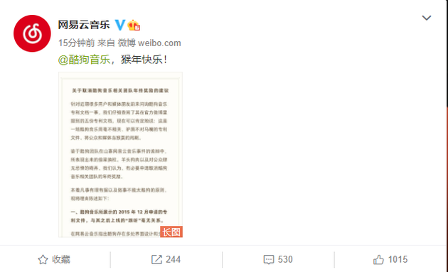 网易云音乐此次提到,建议取消酷狗音乐相关团队年终奖励,因其“专利”一事与酷狗音乐毫不相关。并表示,即便夺来的笋已经堆满网易云音乐的每一个角落。鉴于酷狗音乐耍猴似的行为,还是要给予酷狗音乐以新春祝福。