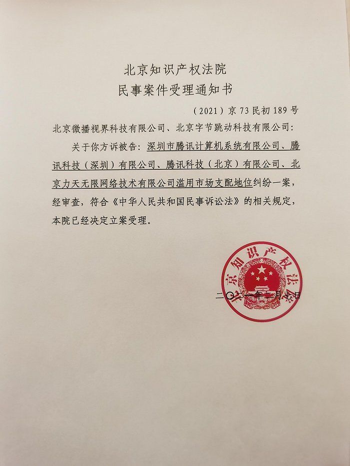 商业 抖音诉腾讯最新进展:已正式立案 2021-02-08 09:19:24 分享 来源:科创板日报据《科创板日报》记者获悉,今日,北京知识产权法院正式受理抖音诉腾讯垄断纠纷案。该案是自2020年底《关于平台经济领域的反垄断指南(征求意见稿)》公布以来,国内首例发生在互联网平台之间的反垄断诉讼。