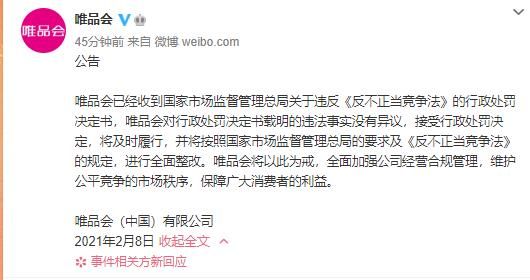 2021年2月8日,市场监管总局依法对唯品会(中国)有限公司作出行政处罚决定,处罚金额300万元。