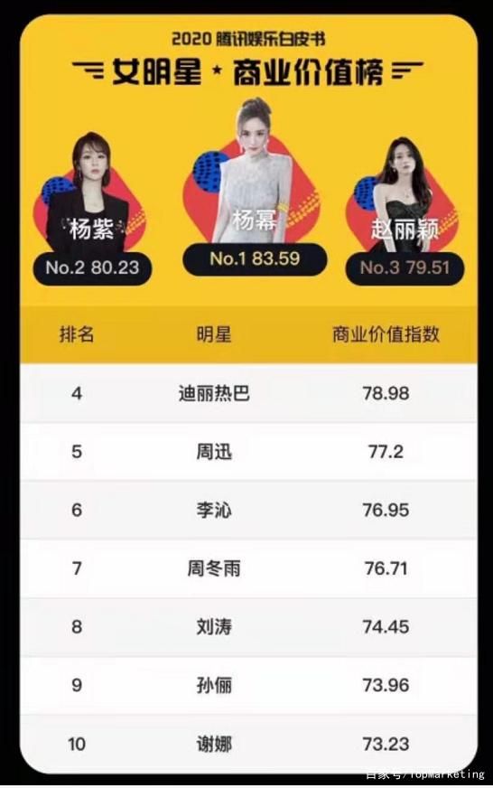 这些作品的成功验证了代言人在腾讯视频的影响力。长期合作中,他们的商业价值也被多次验证。《2020腾讯娱乐白皮书》对女明星商业价值的排名中,杨紫、杨幂、赵丽颖、迪丽热巴都身居TOP4。代言人的粉丝号召力是腾讯视频用户群扩大的重要驱动,粉丝追随爱豆的同时,对腾讯视频的信赖感、美誉度也会加强。