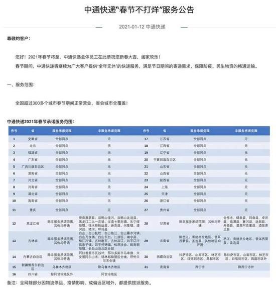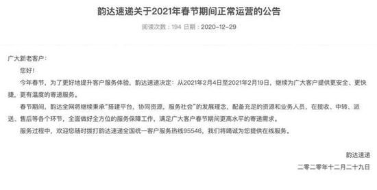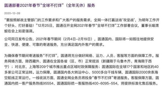 2021年初,中通、圆通、韵达等多家快递企业陆续表示,春节期间(2月4日至2月19日)不停运。