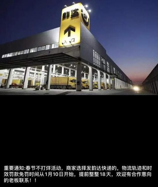 1月9日,一位韵达快递站长发朋友圈,商家选择韵达快递物流轨迹和时效罚款免罚时间从1月10日开始。