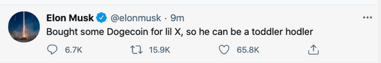 马斯克此前在社交媒体上对狗狗币发表评论,称其为人民的加密货币”。马斯克周三再次发布推文,说他给儿子X Æ A-12买入了一些狗狗币,“所以他可以当个小小持有者了(toddler hodler)。”
