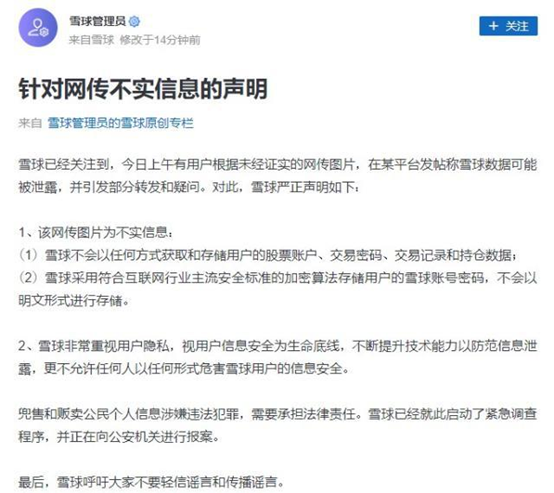 以下为雪球官方《针对网传不实信息的声明》全文: