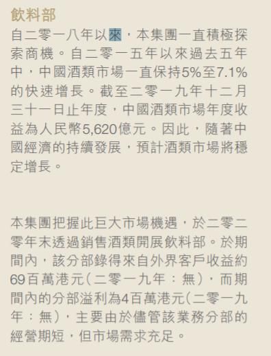 信阳毛尖在财报中表示,“自2018年以来,本集团一直积极探索商机。自2015年以来的过去5年,中国酒类市场一直保持5%至7.1%的快速增长。截至2019年12月31日止,中国酒类市场年度收益为5620亿元。因此,随着中国经济的持续发展,预计酒类市场将稳定增长。本集团把握巨大市场机遇,于2020年末通过销售酒类拓展饮料部。”