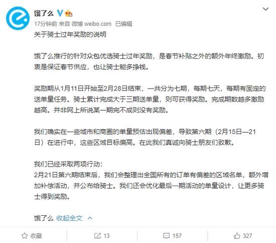 炣燃科技2月19日讯(江丞华) 2月19日下午,针对骑手春节奖励的争议,饿了么通过官方微博发布声明澄清表示,并非网上所说某一期完不成则没有奖励,该平台确实在一些城市和商圈的单量预估出现偏差,区域目标偏高,在此,真诚向骑士朋友们致歉。