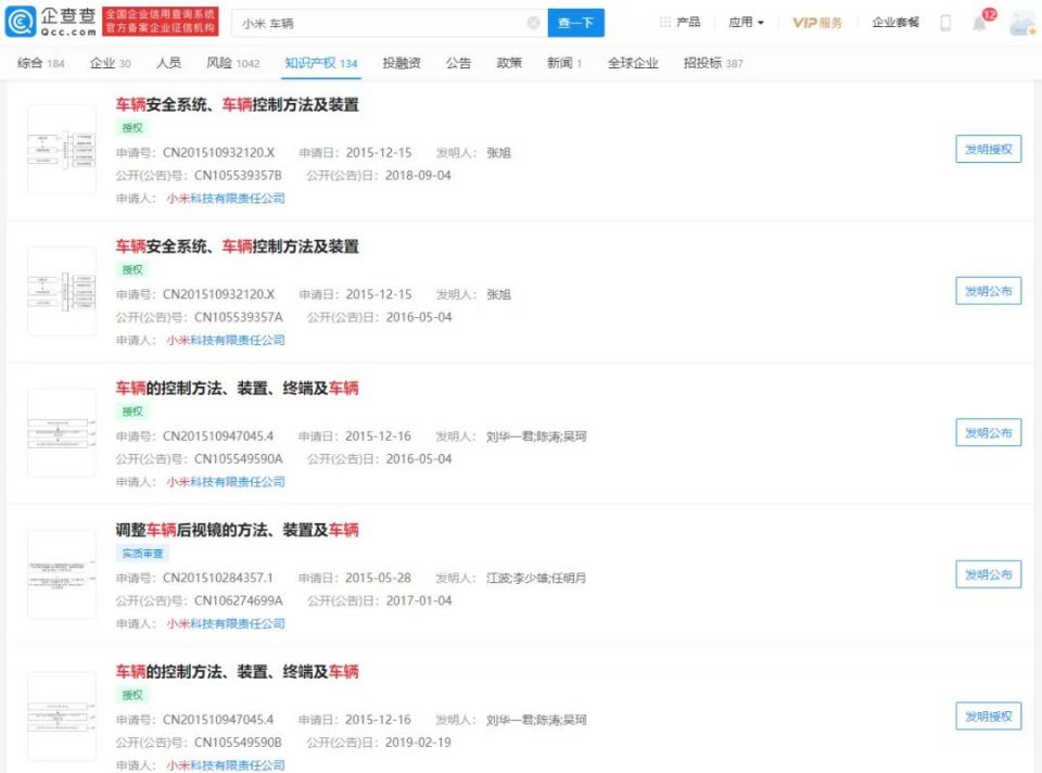 企查查APP显示,当前小米关联公司拥有的与车辆相关的专利共有134件,并且,小米多家关联公司均将汽车零配件作为经营范围登记。