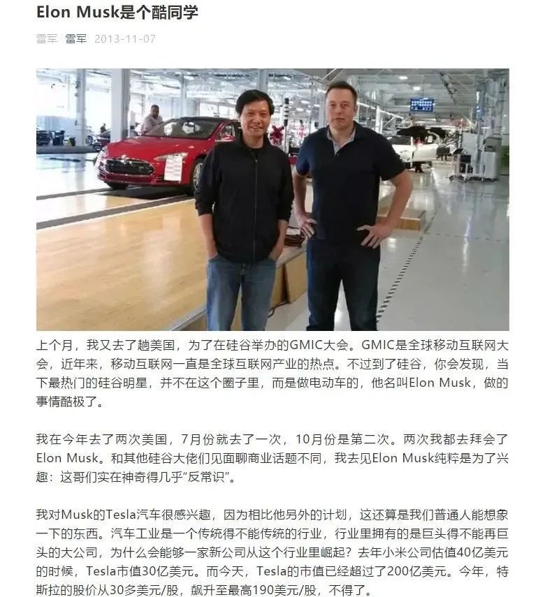早在2013年,雷军就两次去美国拜访特斯拉CEO埃隆·马斯克。他在自己的公众号上撰文称,“我对Musk的Tesla汽车很感兴趣。”