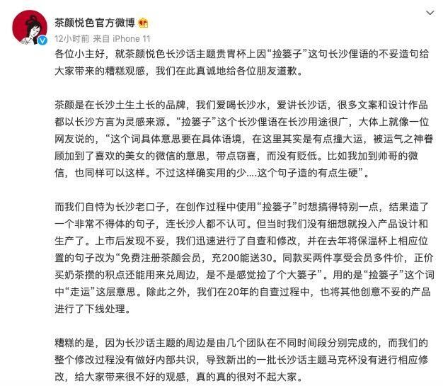 茶颜悦色指出,在创作过程中使用“捡篓子”时想搞得特别一点,结果造了一个非常不得体的句子,连长沙人都不认可。但当时我们没有细想就投入产品设计和生产了。上市后发现不妥,我们迅速进行了自查和修改,并在去年将保温杯上相应位置的句子改为“免费注册茶颜会员,充200能送30。同款买两件享受会员多件价,正价买奶茶攒的积点还能用来兑周边,是不是感觉捡了个大篓子”。用的是“捡篓子”这个词中“走运”这层意思。