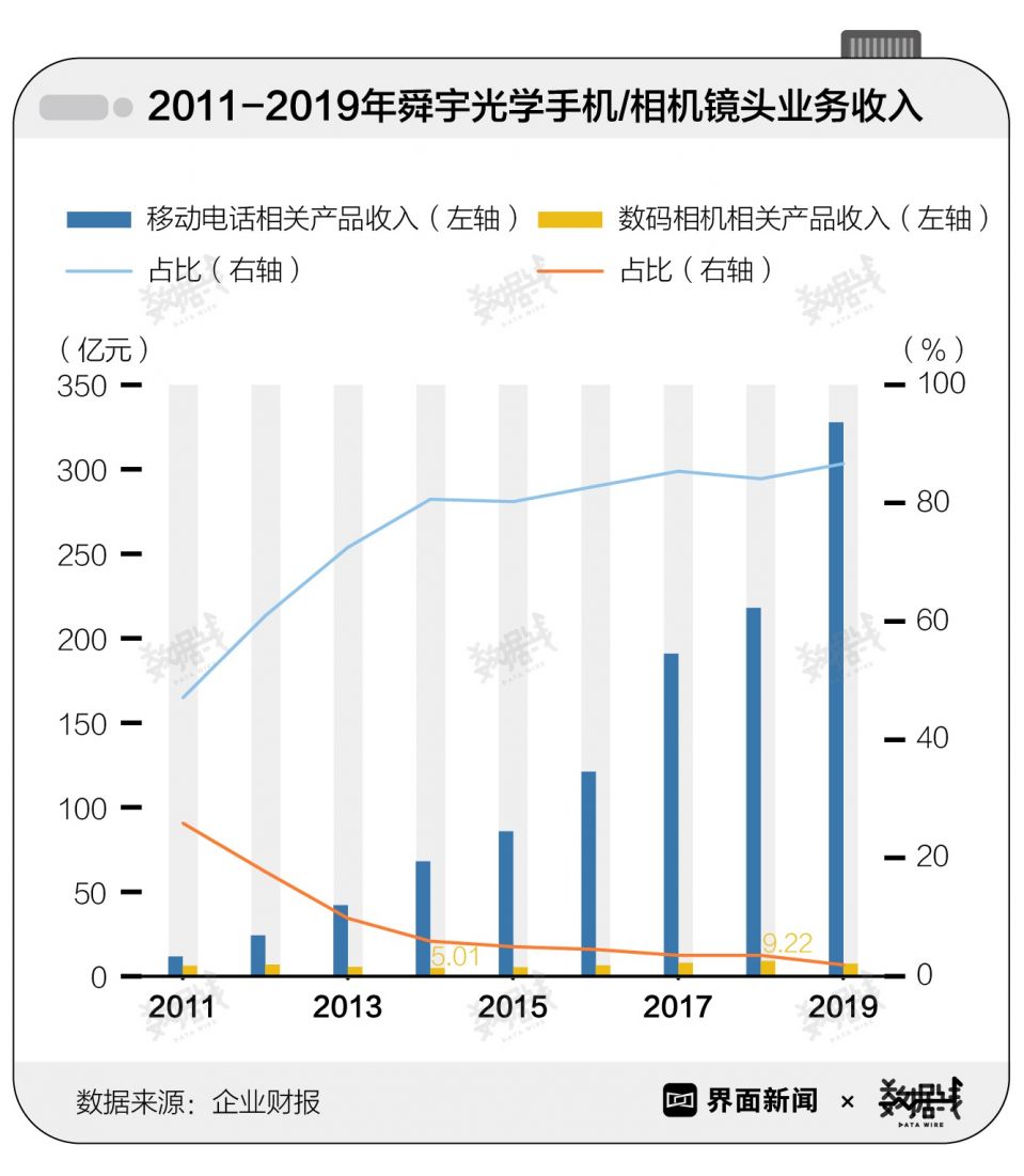 镜头厂商们也纷纷“抛弃”数码相机,把更多精力投入了手机镜头的生产研发。以光学产品制造企业舜宇光学为例,2011年至2019年,企业手机镜头业务收入增长近27倍,占总收入的比例从不足50%一路上涨至87%。而相机镜头业务收入9年来仅增长15%,占比从26%下降至2%。舜宇光学2014年财报中已经提到,由于智能手机所应用的摄像模组不断升级并继续侵占部分普通数码相机市场,数码相机市场需求明显下降。