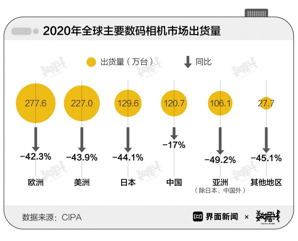 据CIPA统计,2020年数码相机在中国市场的出货量降幅最少,为17%。欧洲、美洲、日本及亚洲其他地区的出货量均下降超40%。