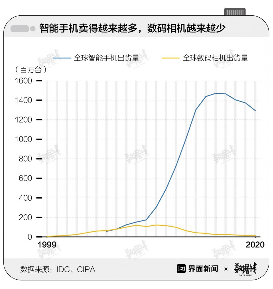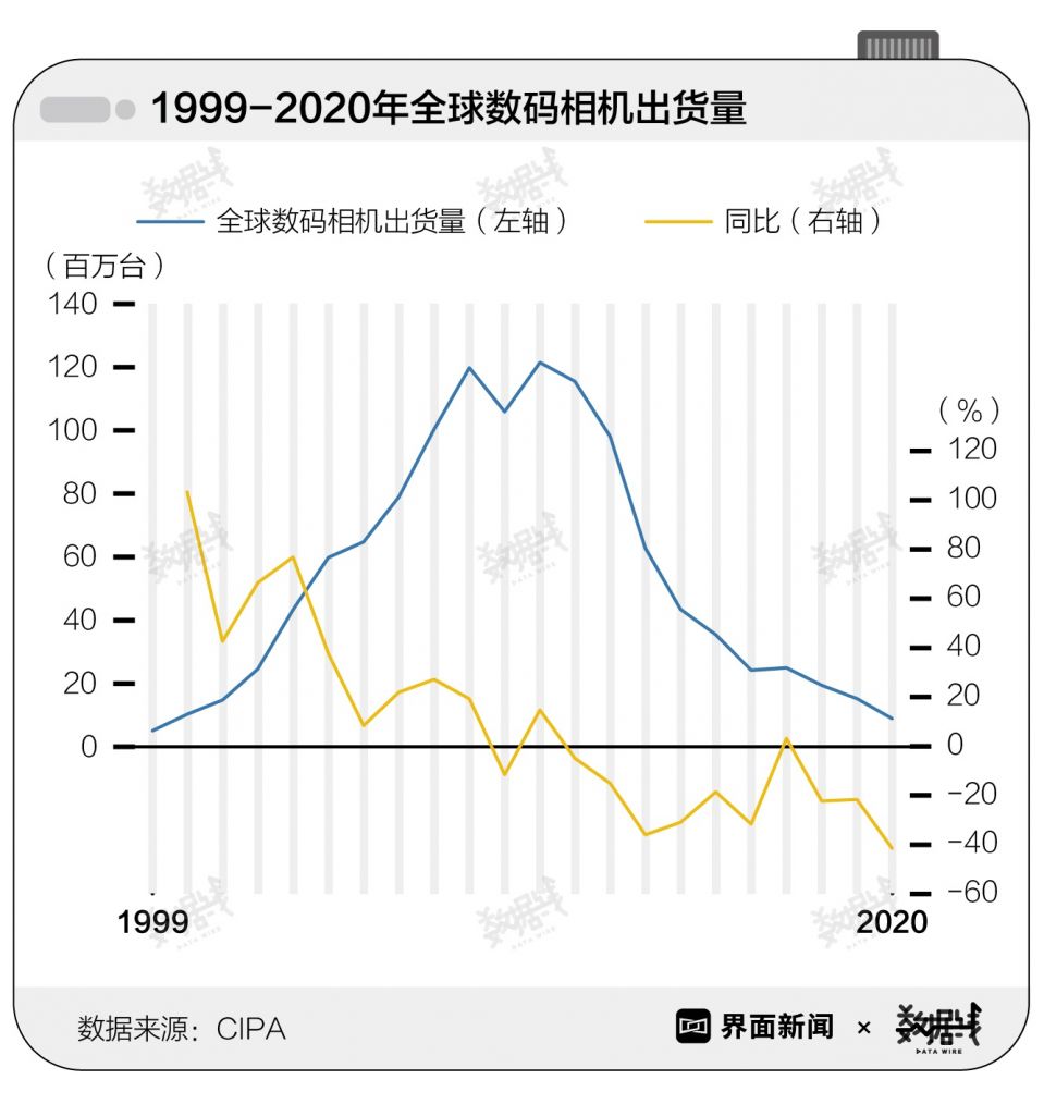 数码相机日渐衰退。近11年来,数码相机出货量从1.2亿台下跌至不足1千万台,降幅达93%。据CIPA(日本相机映像机器工业会)统计,2020年全球数码相机出货量仅为888.6万台,比2000年时1034.2万台的出货量还要低。降幅更是创21年来的新低,同比2019年下降超40%。数码相机时代真的过去了吗?