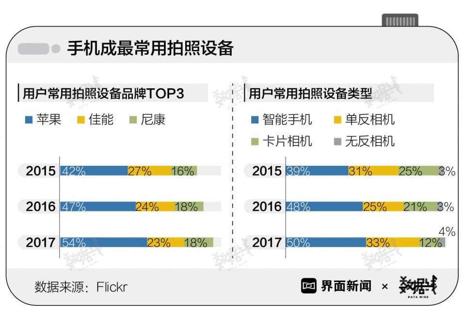 除了普通消费者,手机也获得了摄影爱好者的青睐。据图片分享网站Flickr发布的报告,2017年在Flickr平台上传的照片中,54%的照片由苹果手机拍摄。智能手机已经成为该平台用户最常用的拍照设备。2015年至2017年,平台用户智能手机的使用率提高了11%,已经达到50%。