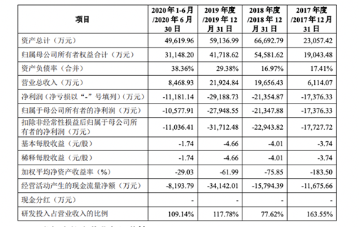 根据其招股书显示,2017年、2018年、2019年及2020年上半年,云知声营收分别为 6114 万元、1.97 亿元、2.19 亿元、8469 万元;净亏损分别为 1.74 亿元、2.14 亿元、2.92 亿元、1.12 亿元。公司3年半来亏损近8亿元,但营收才5.62亿元,同时研发投入较大,报告期内总计投入6.03亿元。