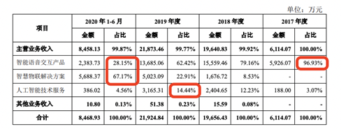 2017年,智能语音交互产品收入占比高达96.93%,但是到2020年上半年,份额已经逐年下降为28.15%。目前,收入比例最大的是智慧物联解决方案,占比为67.17%,而这项业务从2018年才开始有8.53%的收入。此外,人工智能技术服务从2017年的3%占比,到2019年升为14.44%,2020年上半年又下降为了4.56%。