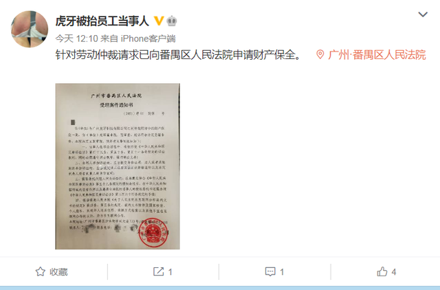 上述微博用户还表示,针对虎牙单方面暴力解除与其的劳动关系一案,已委托律师向广州市劳动人事争议仲裁委员会提出仲裁申请,并向番禺区人民法院申请财产保全。目前,他因无离职证明至今待业。