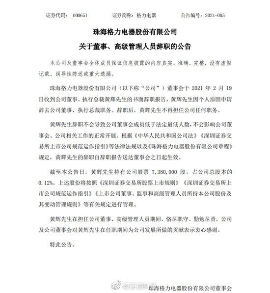 2月21日晚,格力电器发布公告称,董事会于2021年2月19日收到公司董事、执行总裁黄辉的书面辞职报告,黄辉因个人原因申请辞去公司董事、执行总裁职务。辞职后,黄辉不再担任公司任何职务。