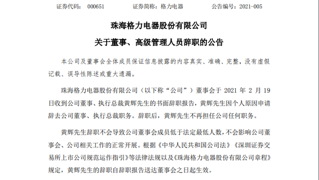 2月21日晚,格力电器公告称,公司董事会于19日收到了董事、执行总裁黄辉的书面辞职报告,黄辉因个人原因辞职,辞职后,其不再担任公司任何职务。