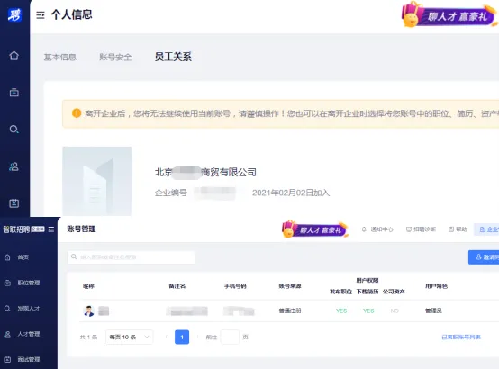账号信息。智联招聘截图