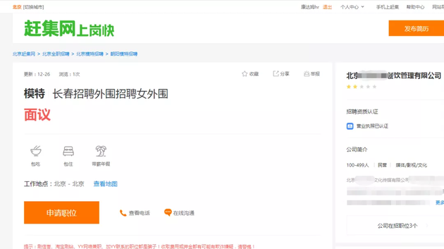此外,记者在赶集网上发现一则“模特,招聘女外围”的招聘信息,发布方显示为一家已通过招聘资质认证的“餐饮管理公司”。点击申请职位后,页面显示投递成功。