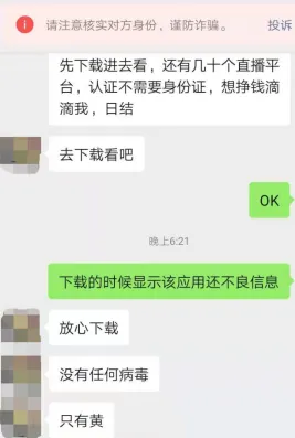 输入上述招聘人员发来的网址,记者搜索到一款App,下载过程中,页面提示该应用含不良信息。对此,他回复“放心下载,没有任何病毒,只有黄”。