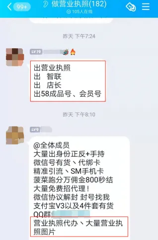 在一个“做营业执照”的QQ群,不时有群成员发布“出营业执照”“出售招聘号”的广告。