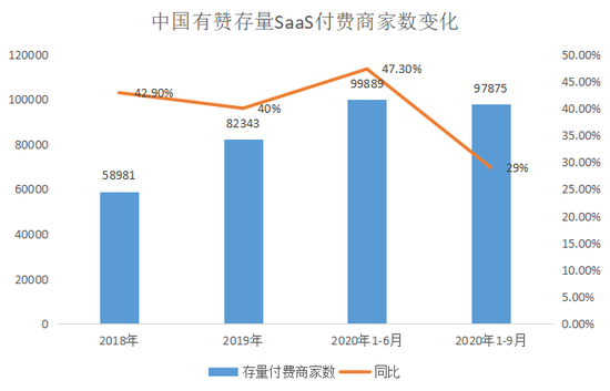 不过,目前这一高增长趋势正在发生变化,2020年前三季度,中国有赞的存量付费商家数同比增速已由上半年的47%降至29%,同时大幅落后2018年、2019年水平,另外新增付费商家数同比增速也从2020年上半年的57%降至22%。