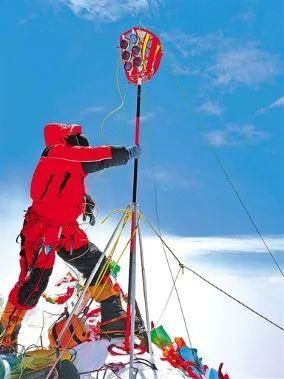 2020珠峰高程测量队员在峰顶竖起测量觇标