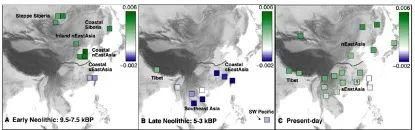 东亚南北方不同时期人群的遗传特点变化示意图