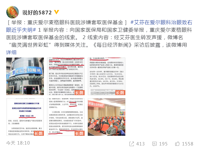 对此,网友评论,“武汉爱尔治瞎患者眼睛,重庆爱尔套取医保基金,全国各地到底有多少爱尔,又到底存在多少问题?”