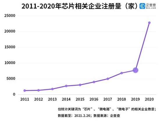 据企查查数据显示,截至2021年2月,我国共有芯片相关企业6.65万家,2020年全年新注册企业2.28万家,同比大涨195%。