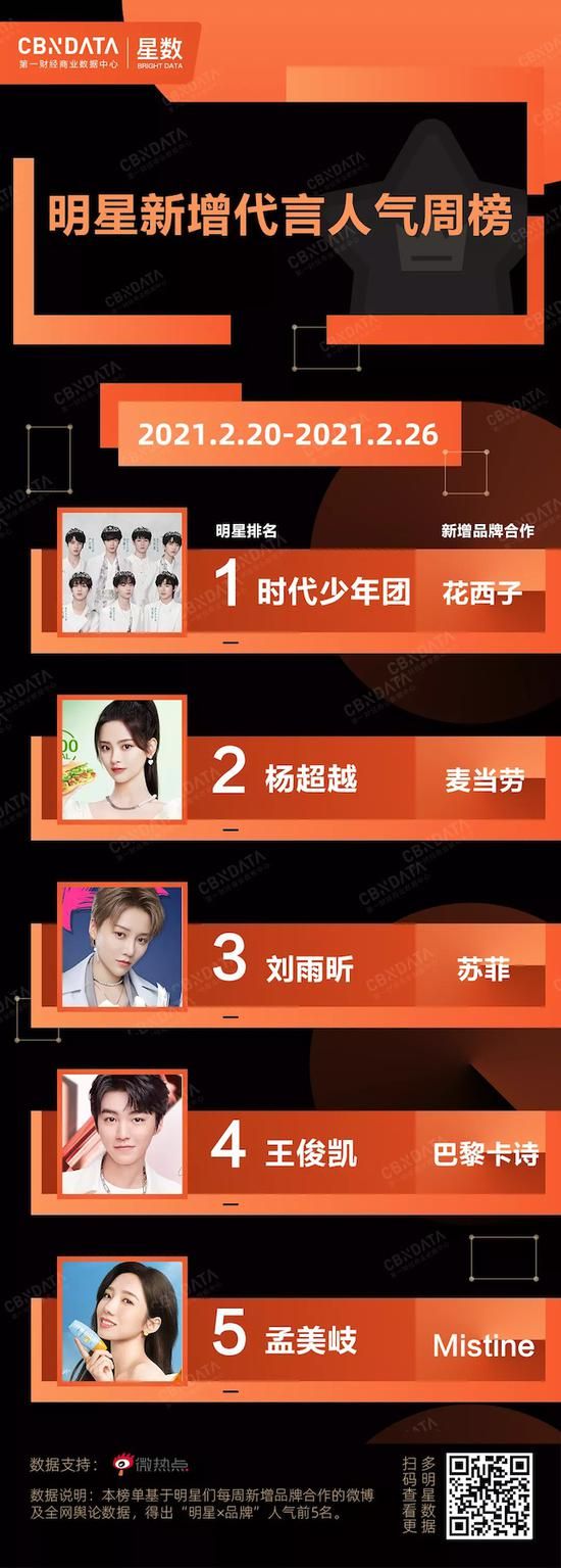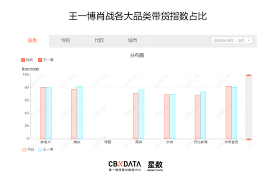 近期,第一财经商业数据中心(CBNData)星数发布的2020四季度“CBNData星数明星消费影响力榜”显示,该季实力带货团为王一博、肖战、杨幂和易烊千玺;黑马带货团为金晨、王霏霏、周冬雨、赵丽颖和张天爱。尤其是王一博、肖战人气及实际带货能力依然很强,两人在家电3C、美妆、食品等品类的带货指数方面不相上下。戚薇去年9月开展了第一场抖音直播带货专场,双11期间单场直播销售额达到6800万元,这也使得她在美妆、女装及日化品类的带货能力均维持在前20名。