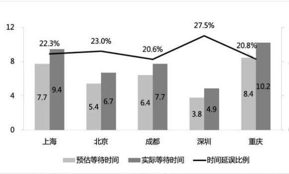 5.五个城市的打车预估时间和实际打车所需时间都存在显著差异(p并且都呈现出实际等待时长高于预估打车时长的情况。