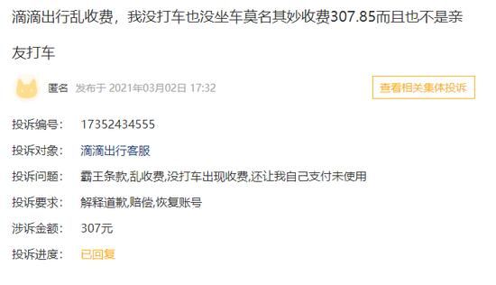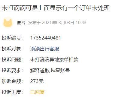 对此,滴滴客服在黑猫平台上回复:已对接到专员处理,正核实。