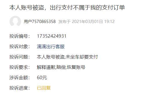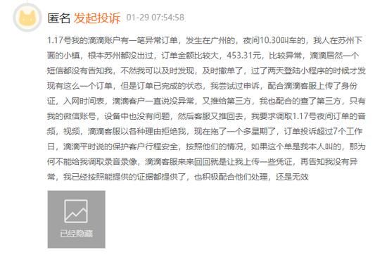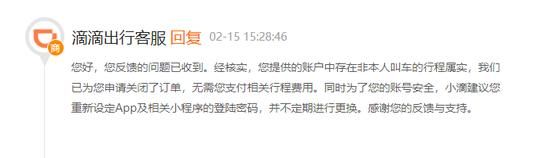 也有用户收到滴滴的核实称:“经核实,您提供的账户中存在非本人叫车的行程属实,我们已为您申请关闭了订单,无需您支付相关行程费用。同时为了您的账号安全,小滴建议您重新设定App及相关小程序的登陆密码,并不定期进行更换。感谢您的反馈与支持。”
