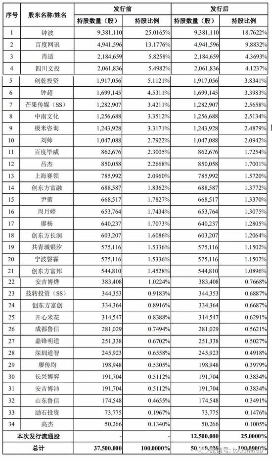 百度共持股为15.478%,为公司第二大股东,四川文投持股为5.5%,创乾投资持股为5.11%,芒果传媒持股为3.42%,中南文化持股为3.35%,极米咨询持股为3.32%,上海赛领持股为2.1%,创东方一共持股5.7892%。