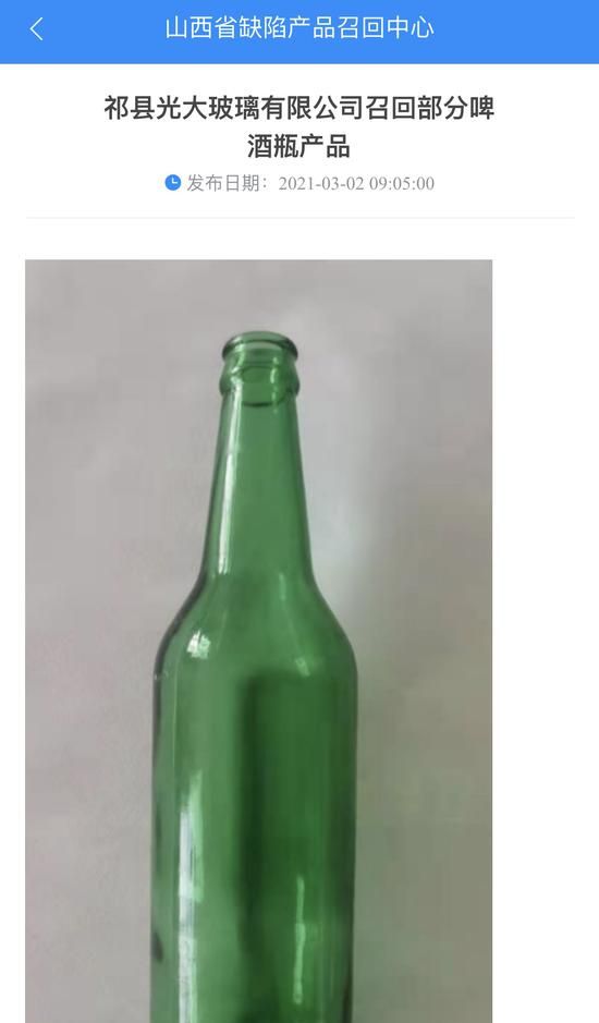中华网酒业讯 3月2日,山西省缺陷产品召回中心发布《祁县光大玻璃有限公司召回部分啤酒瓶产品》(下文简称“《召回信息》”)称,日前,祁县光大玻璃有限公司按照《消费品召回管理暂行规定》的要求,向山西省市场监督管理局备案了召回计划,自即日起,召回2019年5月2日至2019年5月8日生产的型号规格为500ml的啤酒瓶,涉及数量 2206845只。