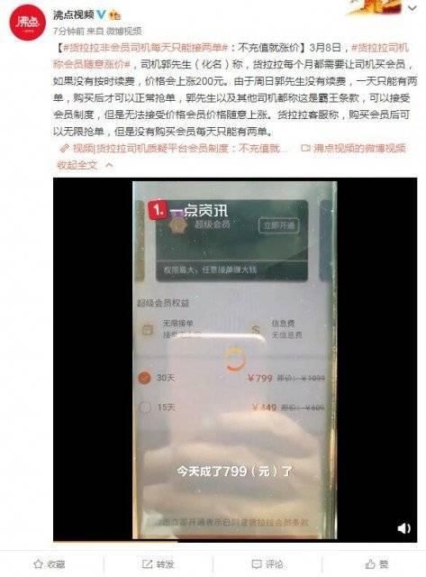 商业 货拉拉再曝要求司机买会员,会员价格随意上涨 2021-03-09 09:41:03 分享 来源:沸点视频据沸点视频报道,今日,货拉拉司机郭先生称,货拉拉每个月都需要让司机买会员,599到1099的价格不等。如果没有按时续费,价格会上涨200元,一天只能有两单。由于周日错过了续费,郭先生被逼无奈,只能花费799购买会员恢复正常抢单。郭先生认为,这是霸王条款,可以接受会员制度,但是无法接受价格会员价格随意上涨。对此,货拉拉客服回应称,会员可以根据个人接单情况购买,购买后可以无限接单以及抢单模式,但是没有会员每天只能接两单。