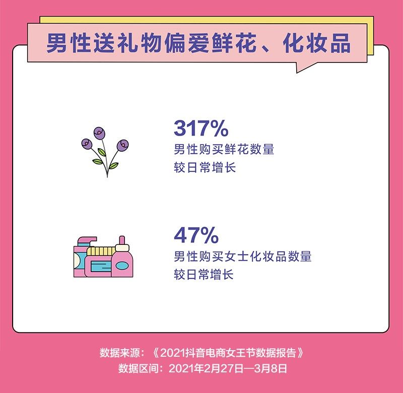值得关注的是,在这个女性专属节日中,很多男性选择购买礼物向亲人或伴侣表达心意。从报告来看,活动期间,男性购买鲜花的数量较日常增长3倍多,购买女性化妆品的数量较日常增长47%,其中,他们消费最多的是面膜、面护套装。