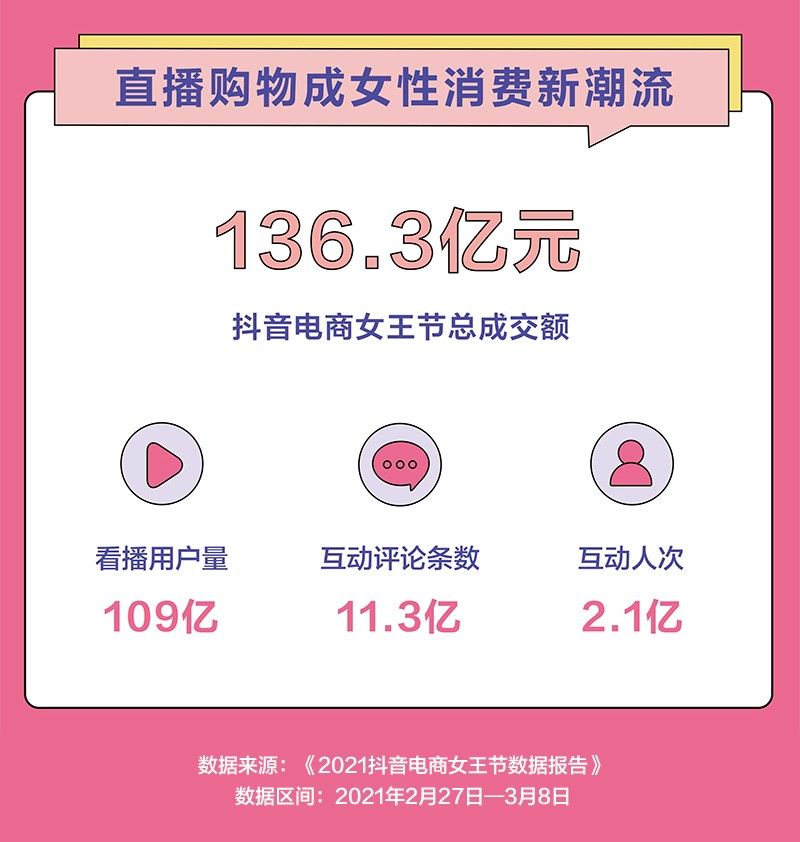 报告显示,自2月27日至3月8日,抖音电商“女王节”总成交额136.3亿元。活动期间,女性达人带货销售额占全部抖音达人销售额的64%。越来越多的女性从业者加入抖音进行短视频或直播带货,翻开了事业新篇章。