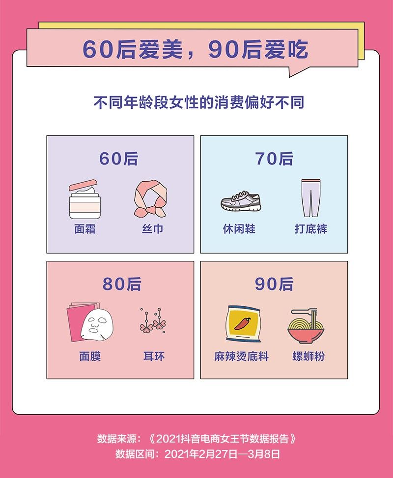 不同年龄段女性的消费偏好不同。报告显示,60后女性爱保养和装扮,喜欢购买面霜、丝巾;70后注重衣着舒适性,休闲鞋、打底裤成为她们的消费重点;80后关注护肤和配饰,热衷消费面膜、耳环;90后钟情于美食,尤其是麻辣烫底料、螺蛳粉等方便食品。