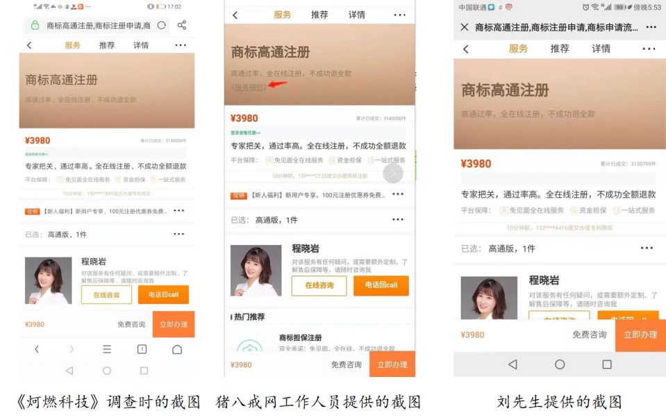 下载了猪八戒APP后不久,刘先生就接到了自称猪八戒网的工作人员的电话,“工作人员介绍的时候跟我说,他们注册商标是不成功退全款,正好那个时候网站还有活动,优惠价格2888元,我再三跟对方确定是不是不成功就退全款,他回答是。”
